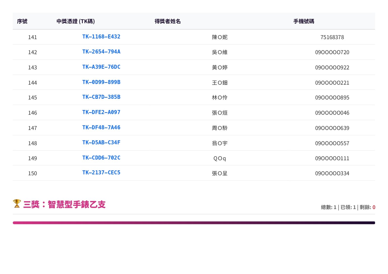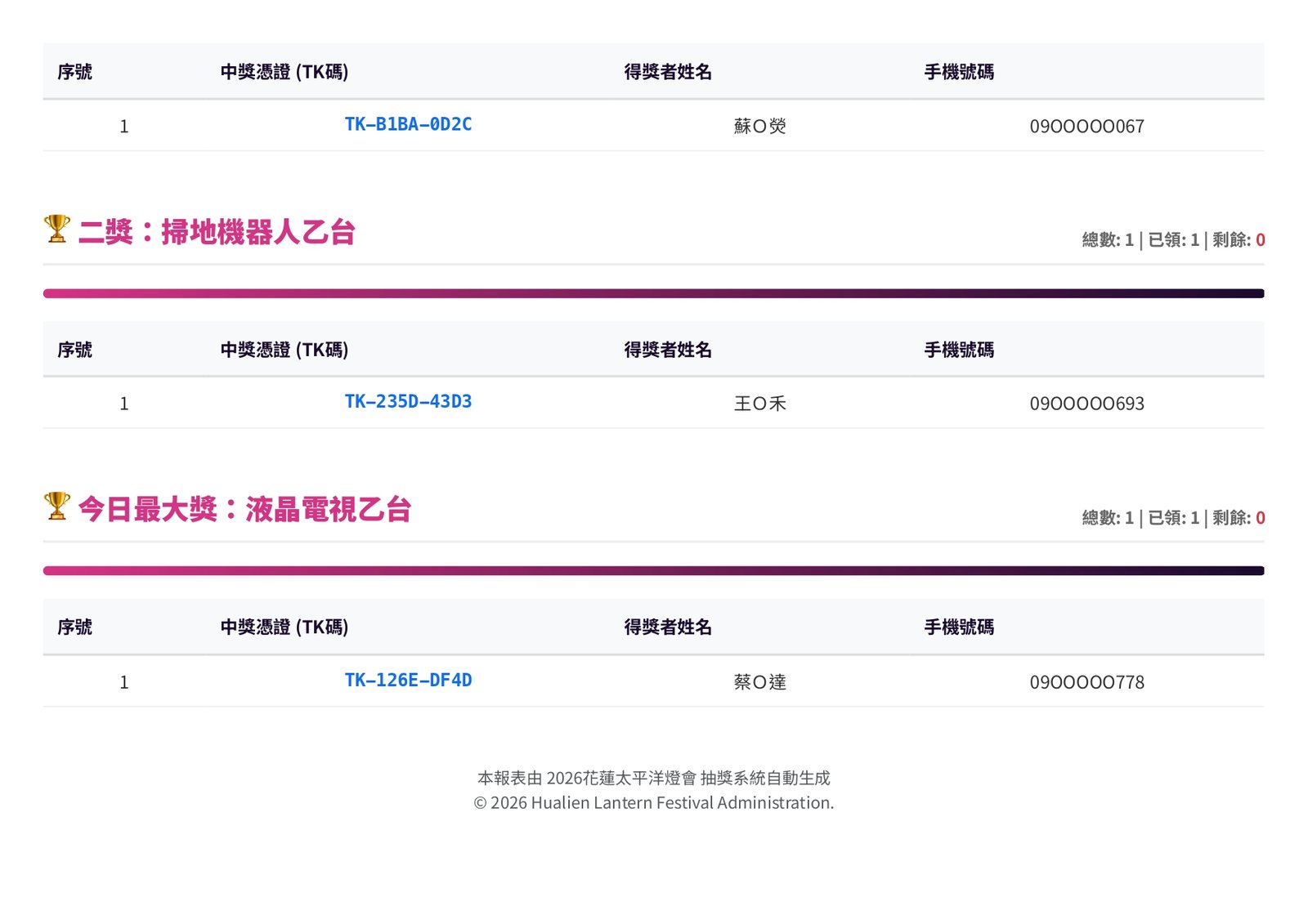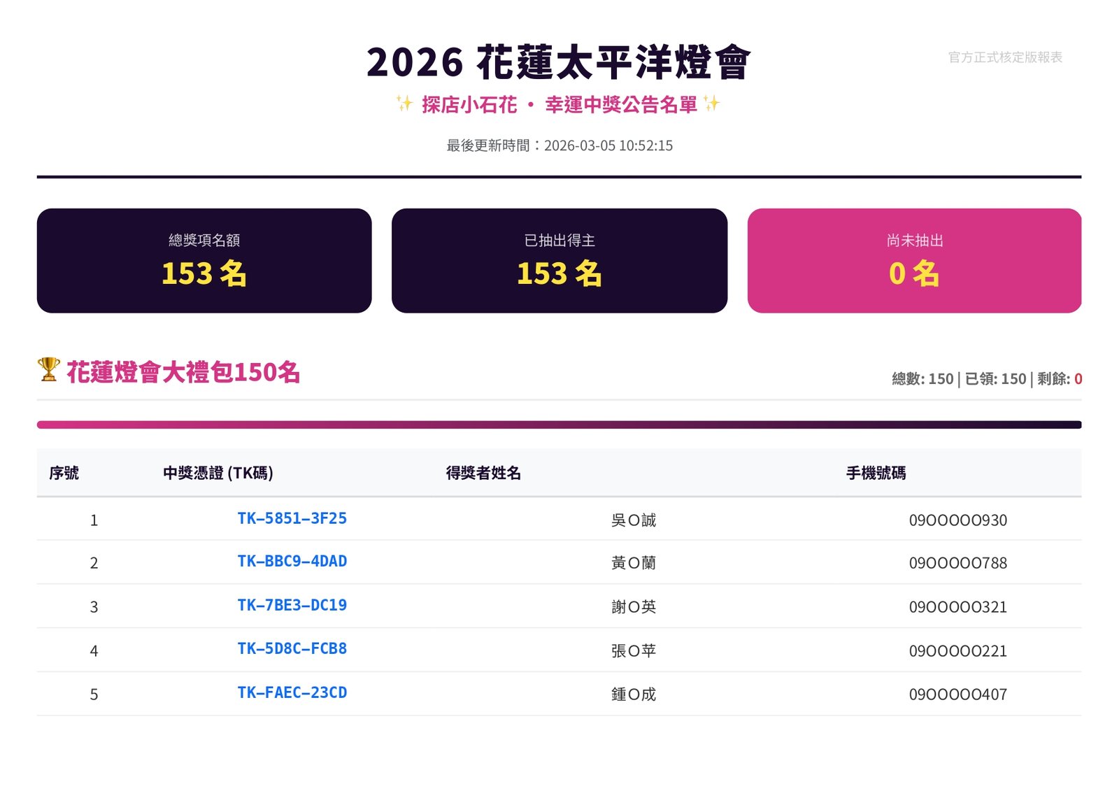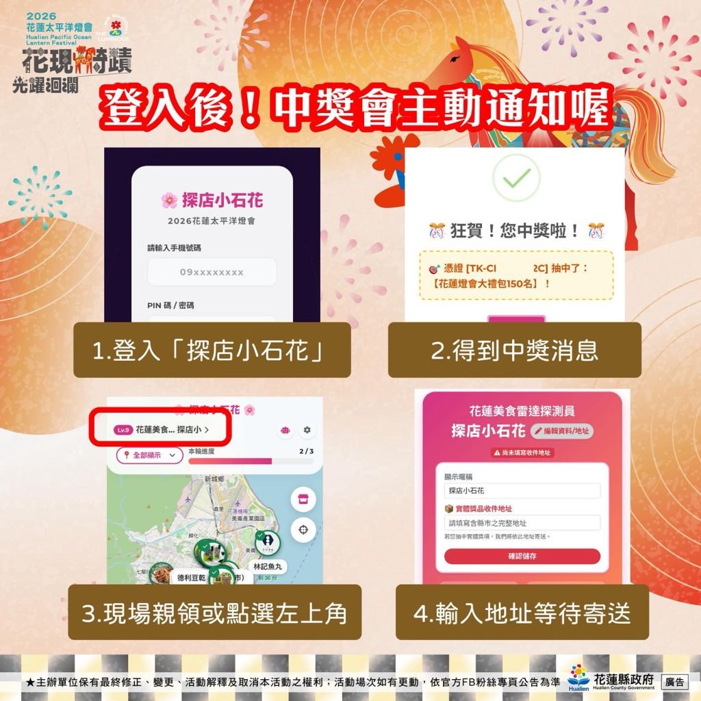 0 查詢中獎 元宵抽大獎|得獎名單出爐 ♞花現騎蹟|光躍洄瀾♞ 元宵抽大獎|得獎名單出爐!快來看看幸運兒是不是你 花生編提醒:元宵晚會的 抽大獎得獎名單已經公布啦!快點打開『探店小石花』網址看看,說不定幸運兒就是你~ 得獎者請依照下方步驟填寫資料: 點開『探店小石花』網址確認是否中獎https://reurl.cc/6GgV5y 依圖示操作,填寫寄送資訊 確認資料送出,就完成啦! 小編收到資料後,就會陸續為大家寄出獎品囉~ 重要提醒得獎者請在 1 個月內完成資料填寫,逾期未填寫者將視同放棄得獎資格,請大家記得把握時間唷!得獎名單同步公佈在2026花蓮太平洋燈會官網‧˚₊☆ .・°‧˚₊☆ .・°‧˚₊☆ .・°‧˚₊☆ .・°‧˚₊☆ °‧˚₊☆ .・° 2026 花蓮太平洋燈會 ♞花現騎蹟・光躍洄瀾♞ 活動地點|花蓮市日出大道(重慶市場、東大門夜市旁) 活動日期|2026.02.07(六)– 03.08(日) 活動時間|每晚 18:00 – 22:00 ( 2/16 除夕休息 ) 更多活動訊息請見官網 https://lantern.hl.gov.tw————— 還沒追蹤?快鎖定我們 「花蓮觀光粉絲團」FB https://reurl.cc/dqv7E6IG https://reurl.cc/aM71oDThreads https://reurl.cc/EbaGEa花蓮旅遊小助理 https://hualien.travel/ai-service/ 主辦單位保有活動最終解釋權#花蓮 #2026花蓮燈會 #花現騎蹟光躍洄瀾 #元宵抽獎名單 #幸運兒 #記得領獎 2026花蓮太平洋燈會TheLuminousWeBloom光之藝術節花現騎蹟光躍洄瀾花蓮山海之光花蓮旅遊